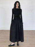 Pleated Patchwork Knit Long Sleeve Midi Dress