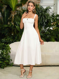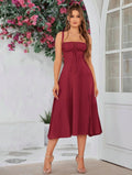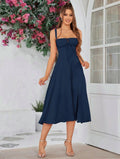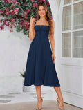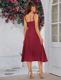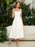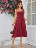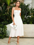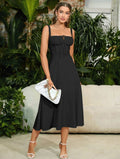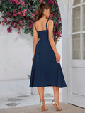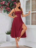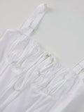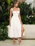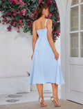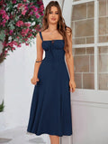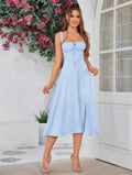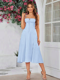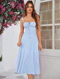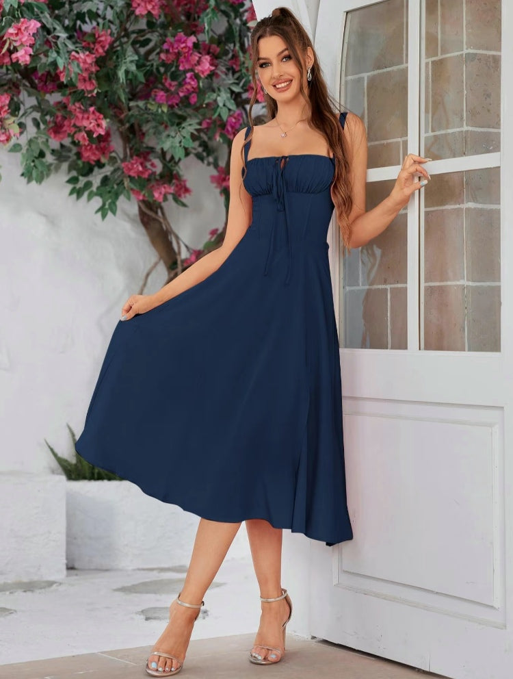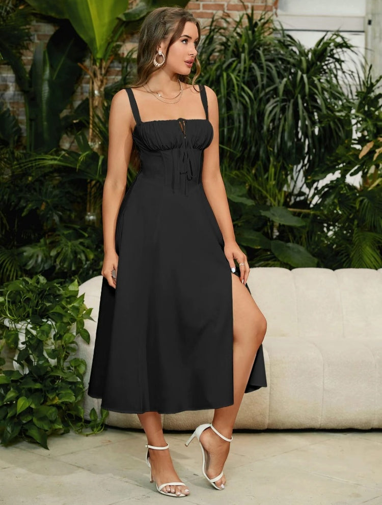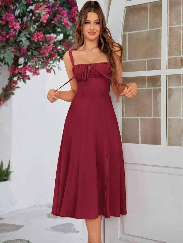 Key details include a front keyhole with a self-tie, a corset bodice for a flattering fit, a front split for a hint of allure, and a criss-cross self-tie at the back for added charm. The dress is fully lined and has a midi length of 48 inches (122 centimeters), making it ideal for summer events.