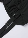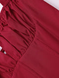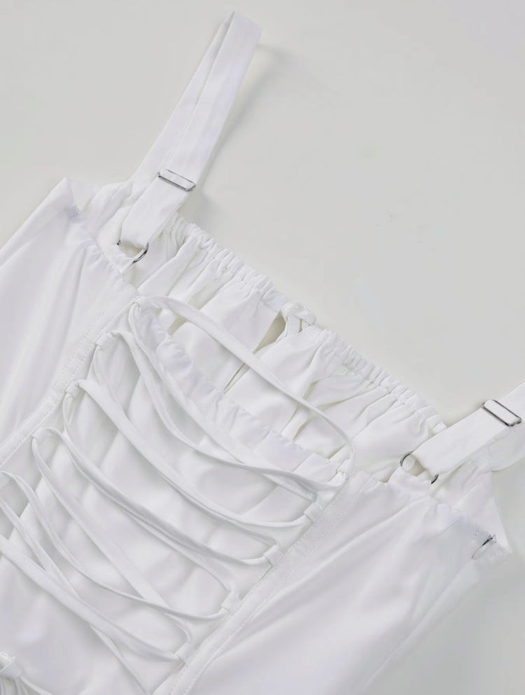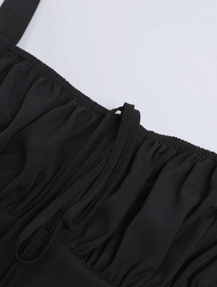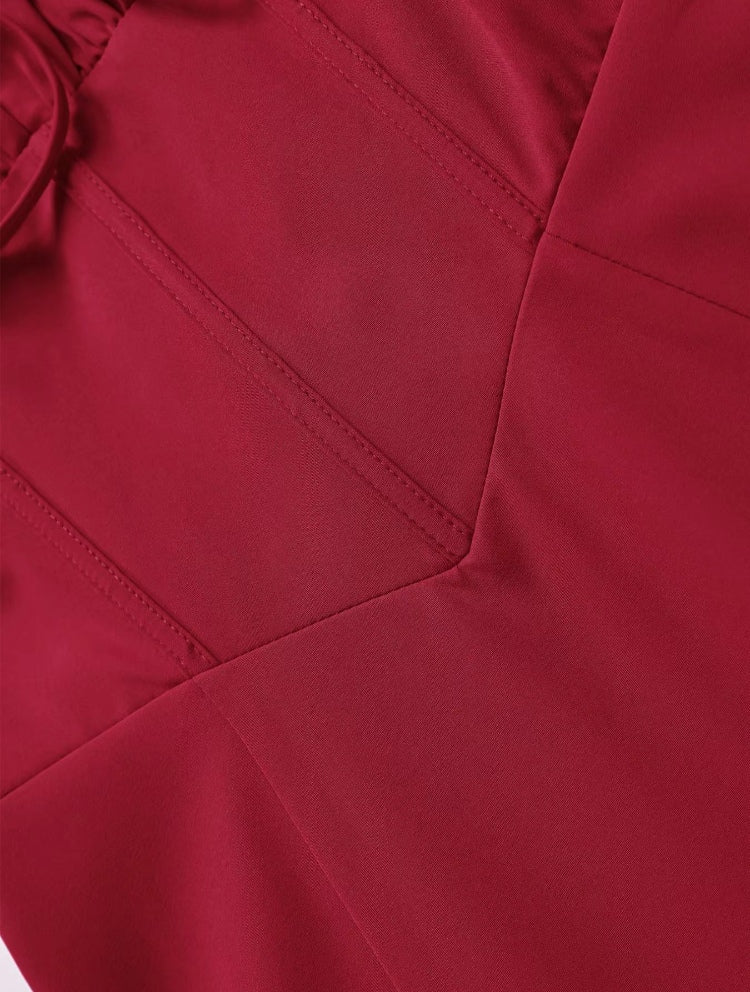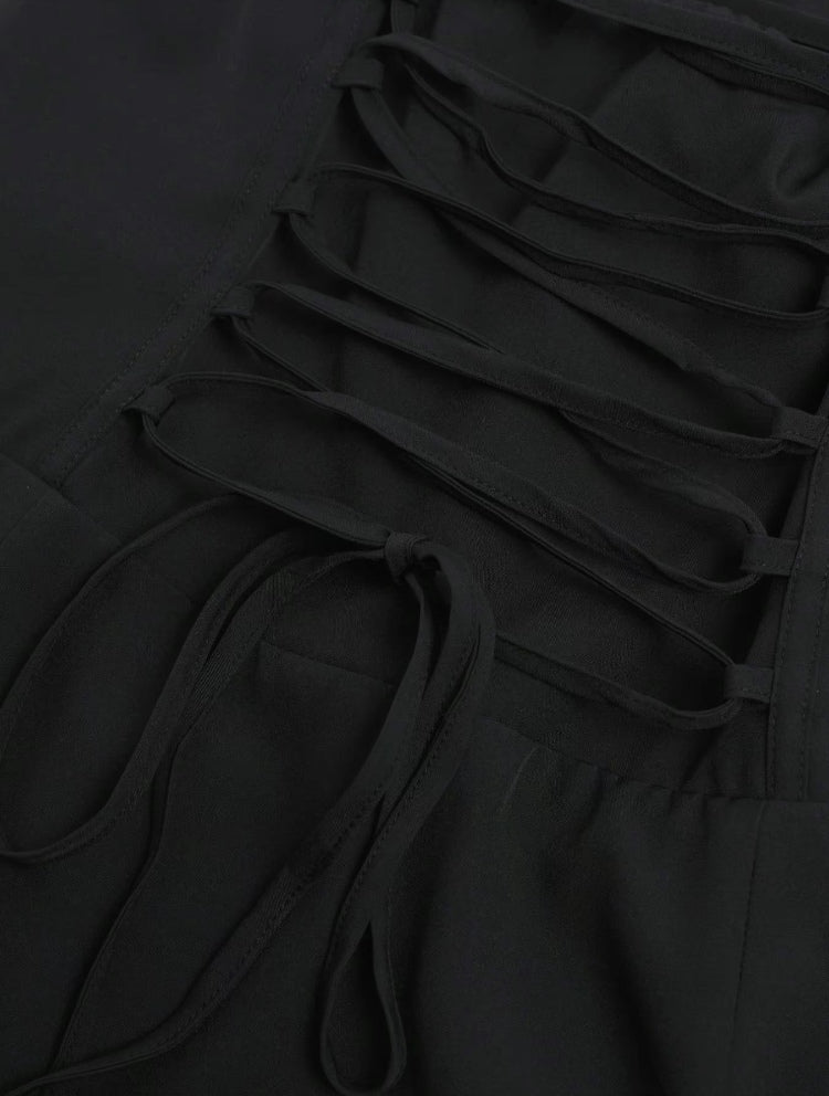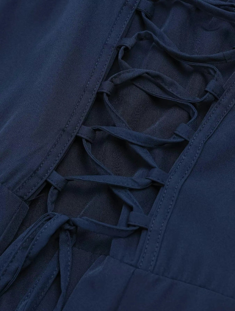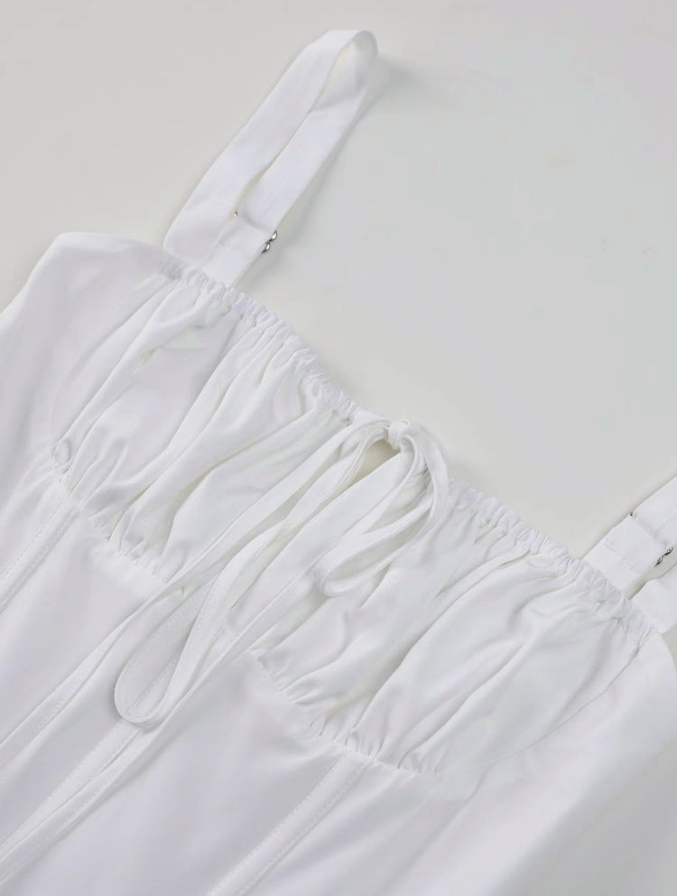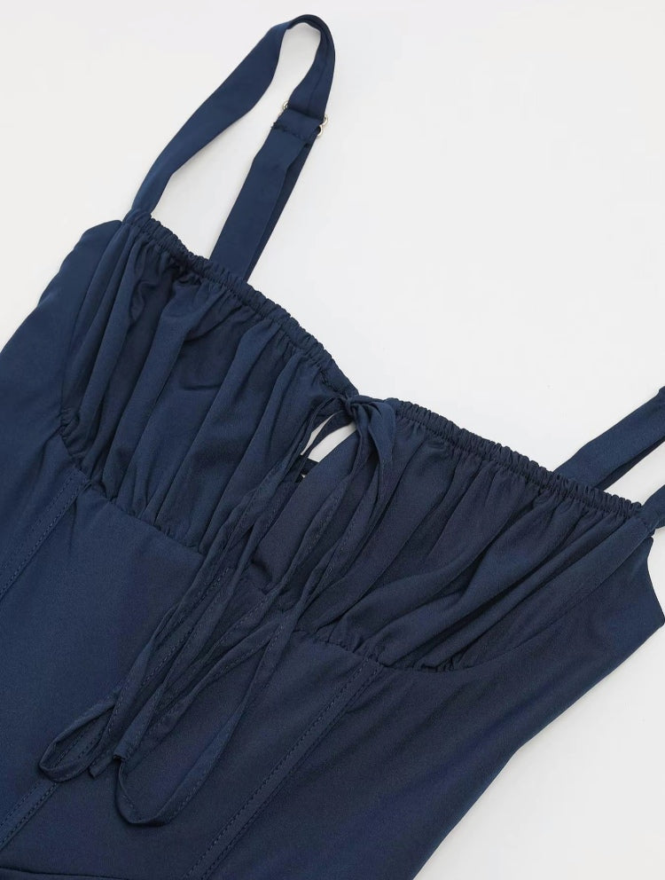 Detailing: Soft gathered cups, keyhole at front with self-tie, corset bodice, split at front, criss-cross self-tie at back